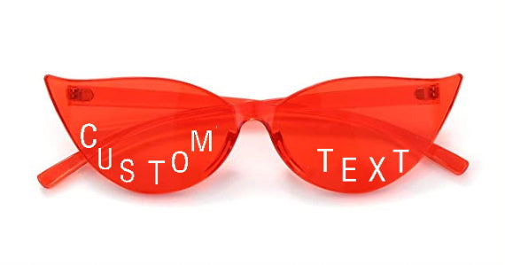 Our Custom Text Red Cat Eye Sunglasses are the ultimate game day accessory! Personalize your pair with any message you would like, such as, your favorite team name, sorority or phrase! Lettering color is white, maximum of 7 letters per lens. Font is as shown.