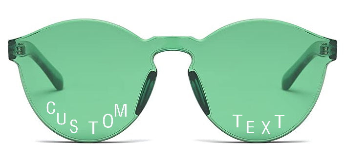 Our Custom Text Frameless Sunglasses are the ultimate game day accessory! Personalize your pair with any message you would like, such as your favorite team name, sorority or phrase! Lettering color is white, maximum of 7 letters per lens. Font is as shown.