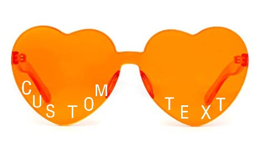 Our Custom Text Orange Heart Sunglasses are the ultimate game day accessory! Personalize your pair with any message you would like, such as, your favorite team name, sorority or phrase! Lettering color is white, maximum of 7 letters per lens. Font is as shown.